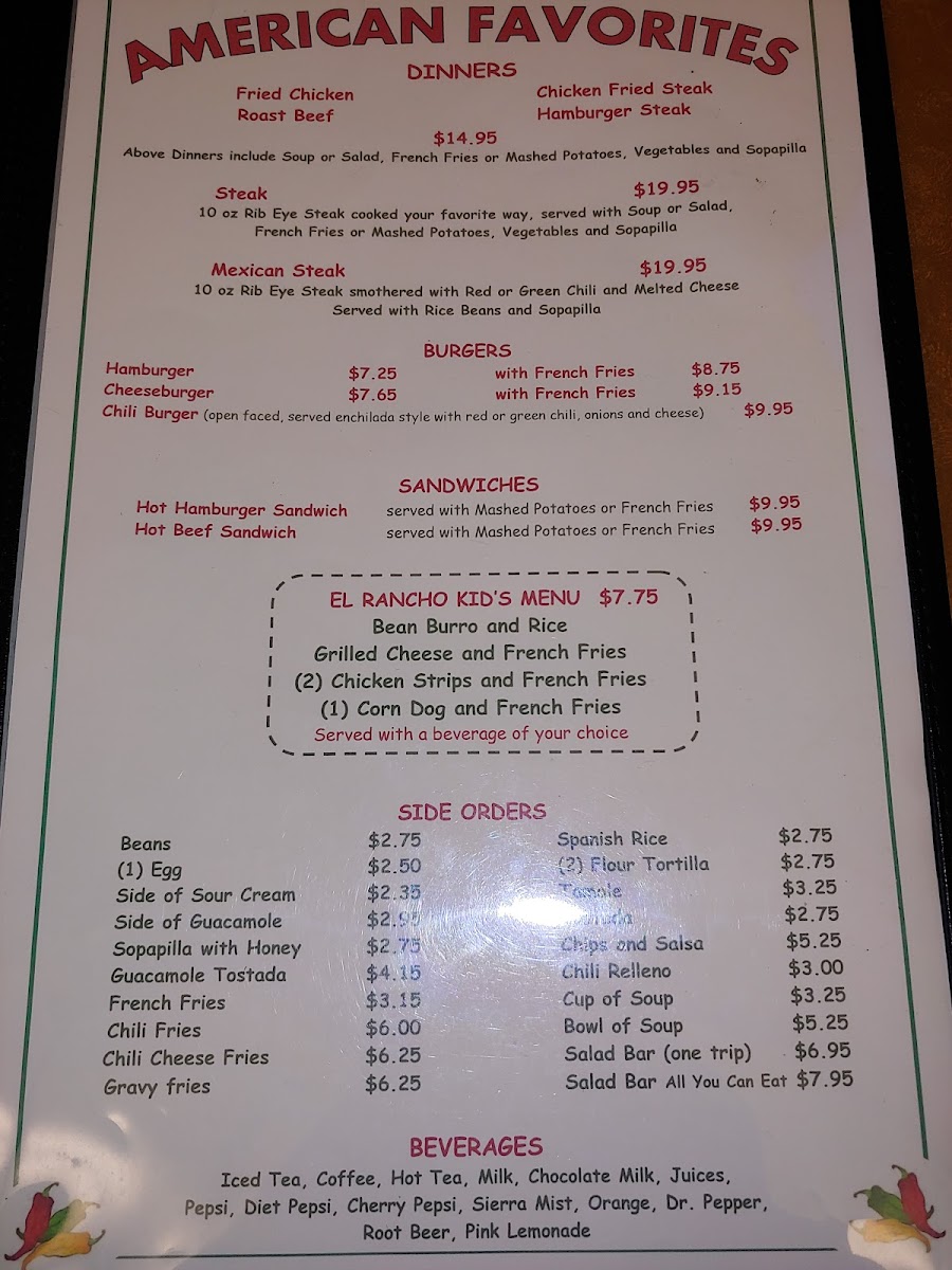 Welcome to El Rancho Restaurant & Motel, a hidden jewel nestled in Holbrook, AZ. This American restaurant offers a delightful fusion of hearty flavors and a warm atmosphere. The menu is abundant with mouthwatering options, featuring standout dishes like the Taco Loco, a crispy flour tortilla filled with grilled chicken or steak, and the Polla A La Parilla, marinated grilled chicken served with traditional sides. With lunch specials starting as low as $4.50, you can savor authentic flavors without breaking the bank.